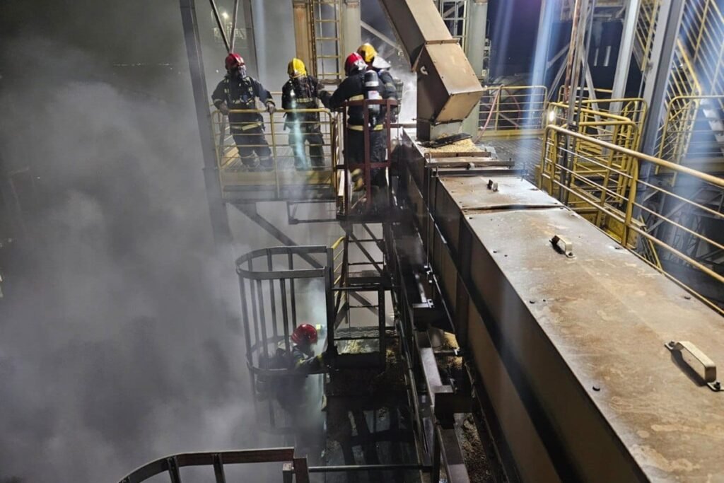 As chamas atingiram uma máquina secadora com capacidade para 100 toneladas de soja com aproximadamente 25 metros de altura — Fonte original: Metrópoles Geral