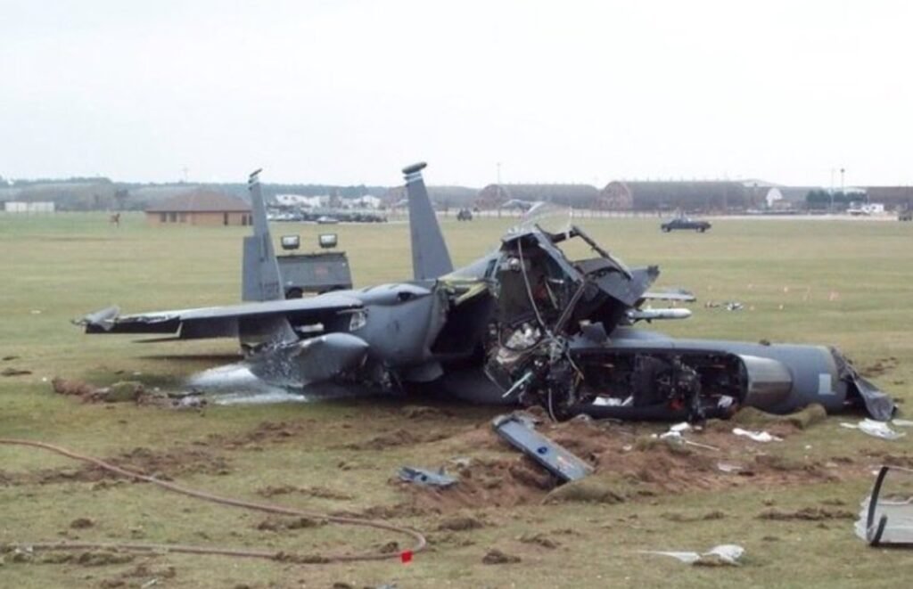 Os dois tripulantes se ejetaram do caça F-15 dos Estados Unidos antes da queda da aeronave no solo — Fonte original: Metropoles